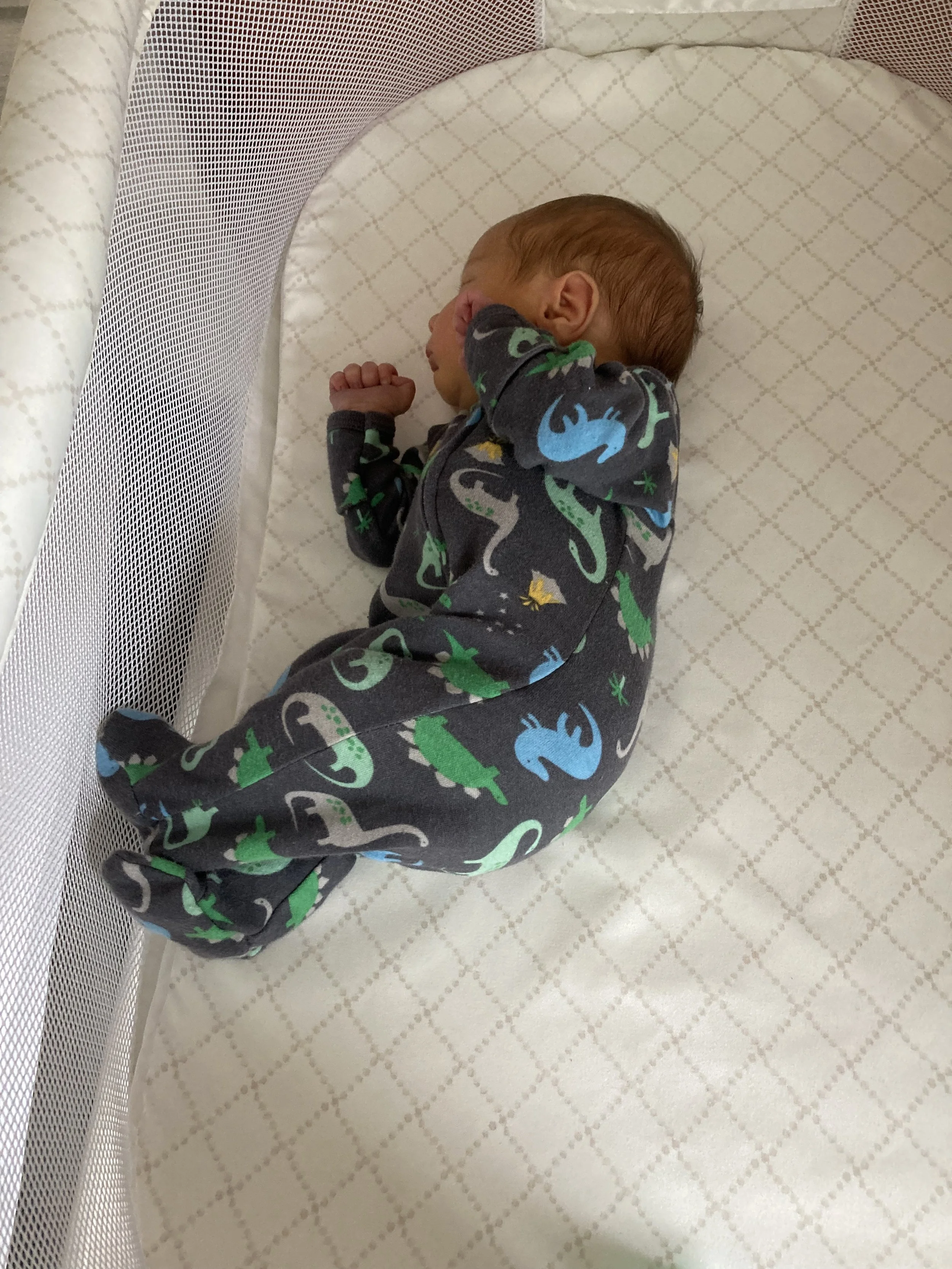 Our safe sleep set up is shown here—over the bed bedrails that have no gaps baby can fall into and suffocate, no gaps between mattress and headboard, a single pillow and light blanket at hip level. I would normally curl around where Juju is, and he would normally be on his back! (He is on his tummy for photo purposes, as I don’t show his face on social).